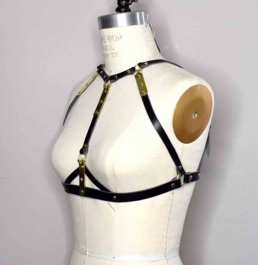 High neck leather harness bra made from luxe vegetable tanned leather with gold or silver hardware.