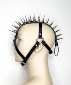 Part headdress, part face mask, this leather adornment adds a vicious, spiked mohawk-like look to any outfit!