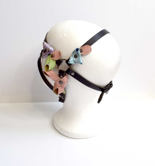 A playful combination of a fetish headpiece and a flower crown, the black leather straps are adorned with pastel leather flowers.