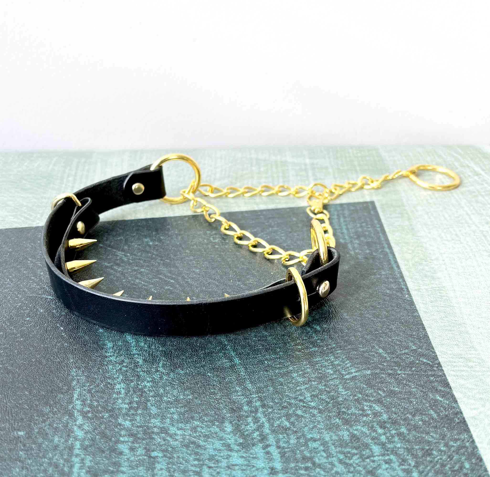 A sadistic little piece perfect for your sub, the Compliance Spiked Leather Martingale Collar features a removable inner spiked section.