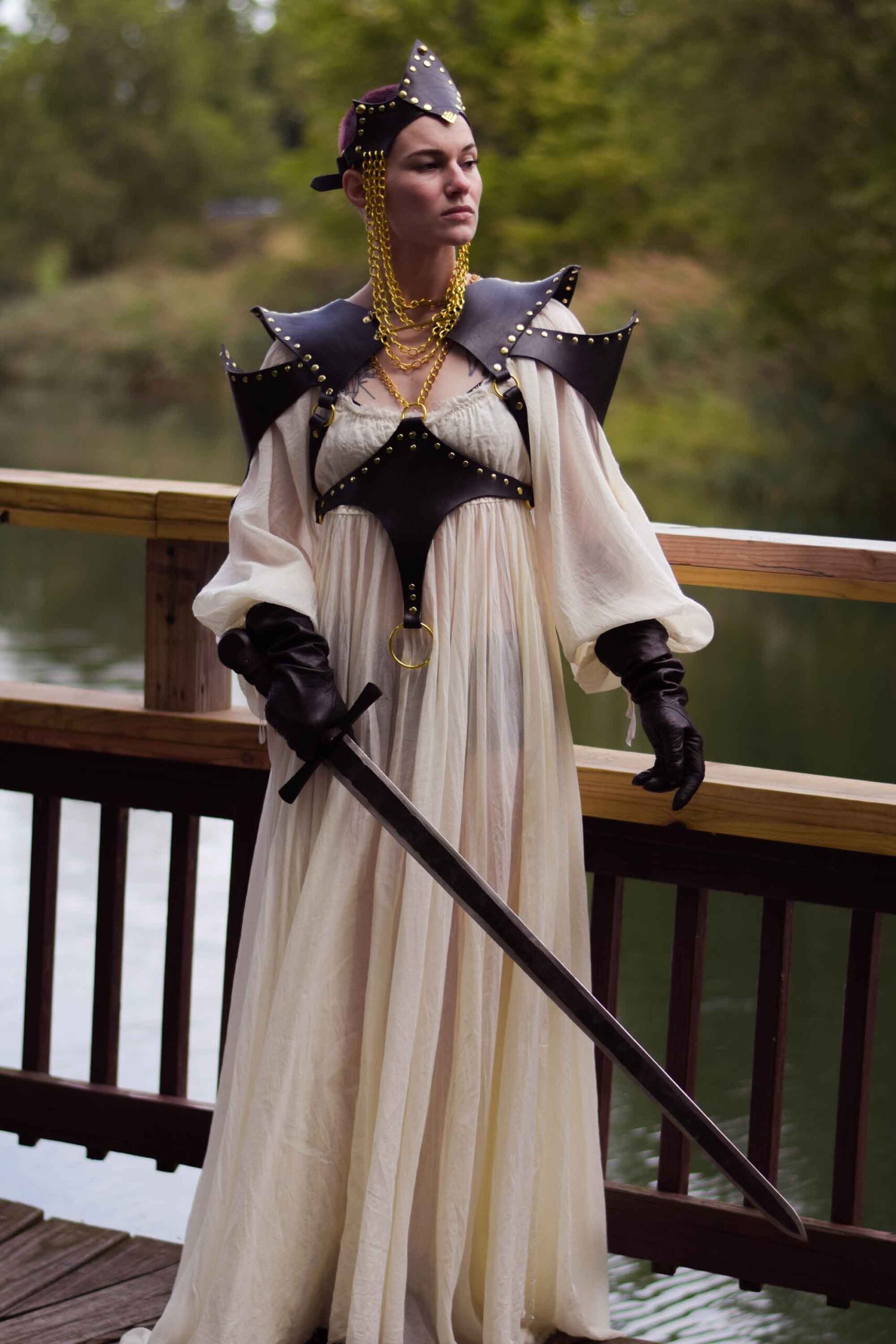 Striking leather underbust harness with gold chain shoulder straps and O-ring drop at the front.