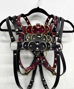 Classic leather chest bulldog harness style piece made from thick leather and accented with gleaming hardware.