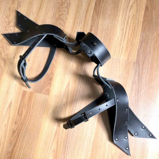 Dramatic heavy leather shoulder harness with flared flanges at the arms.
