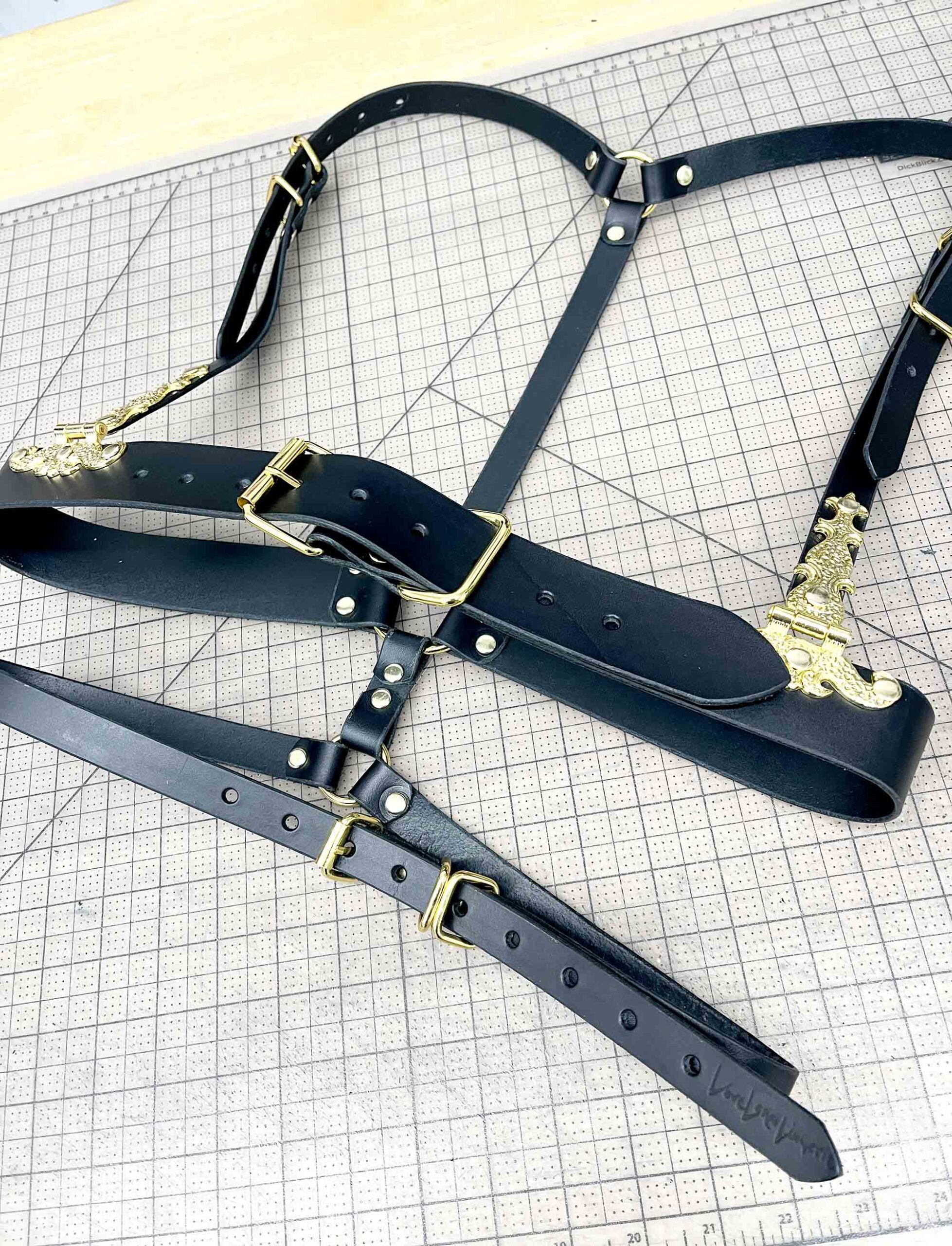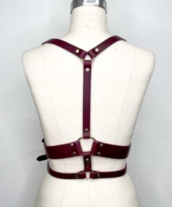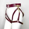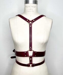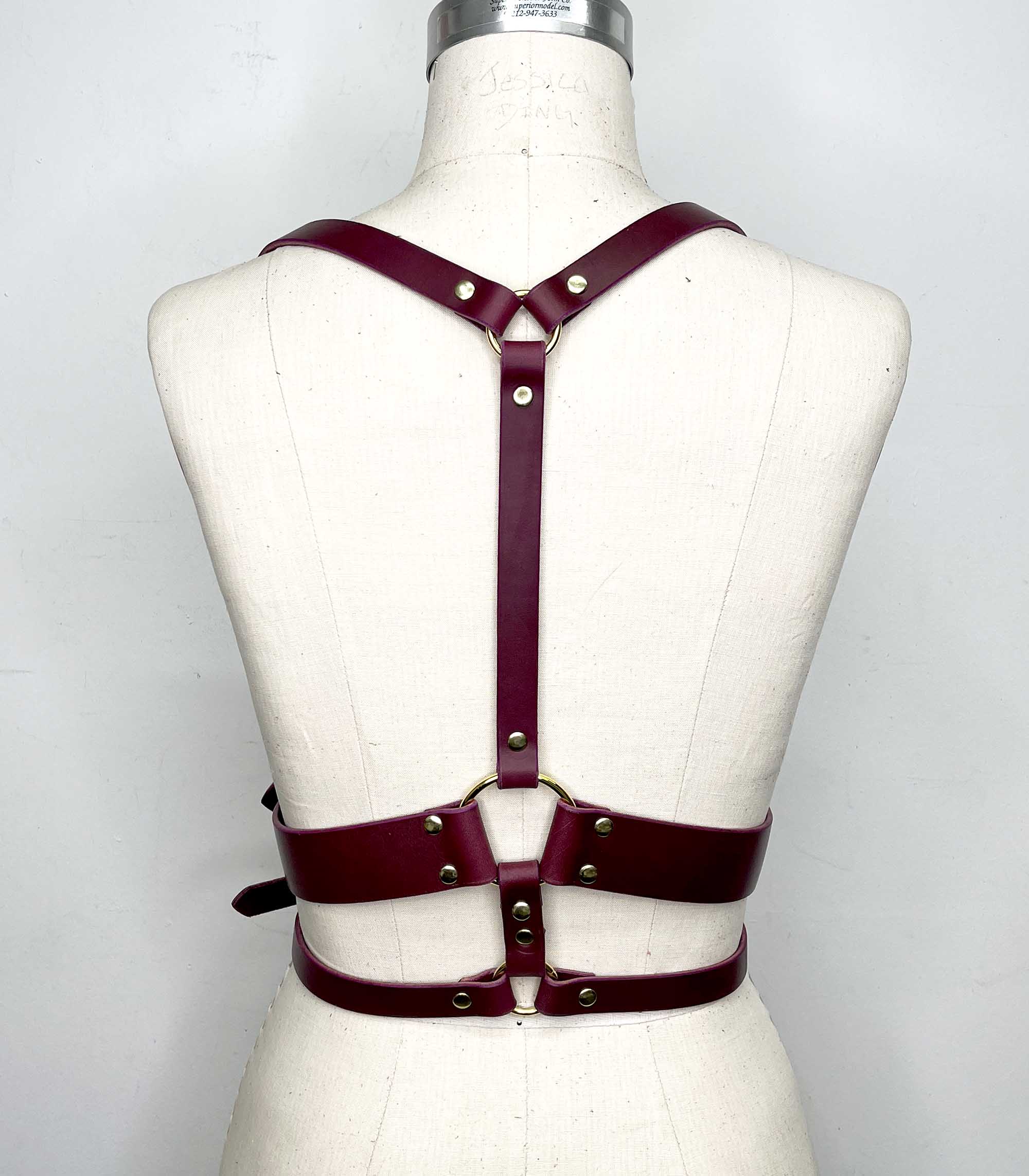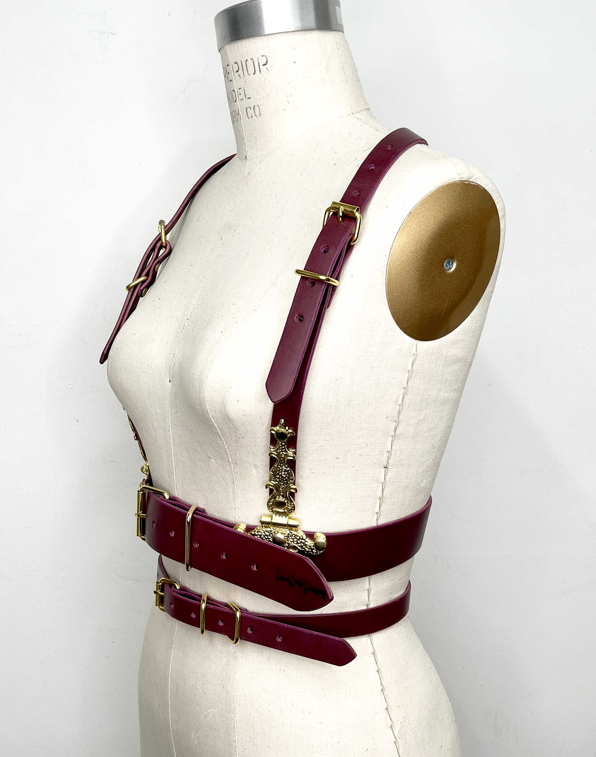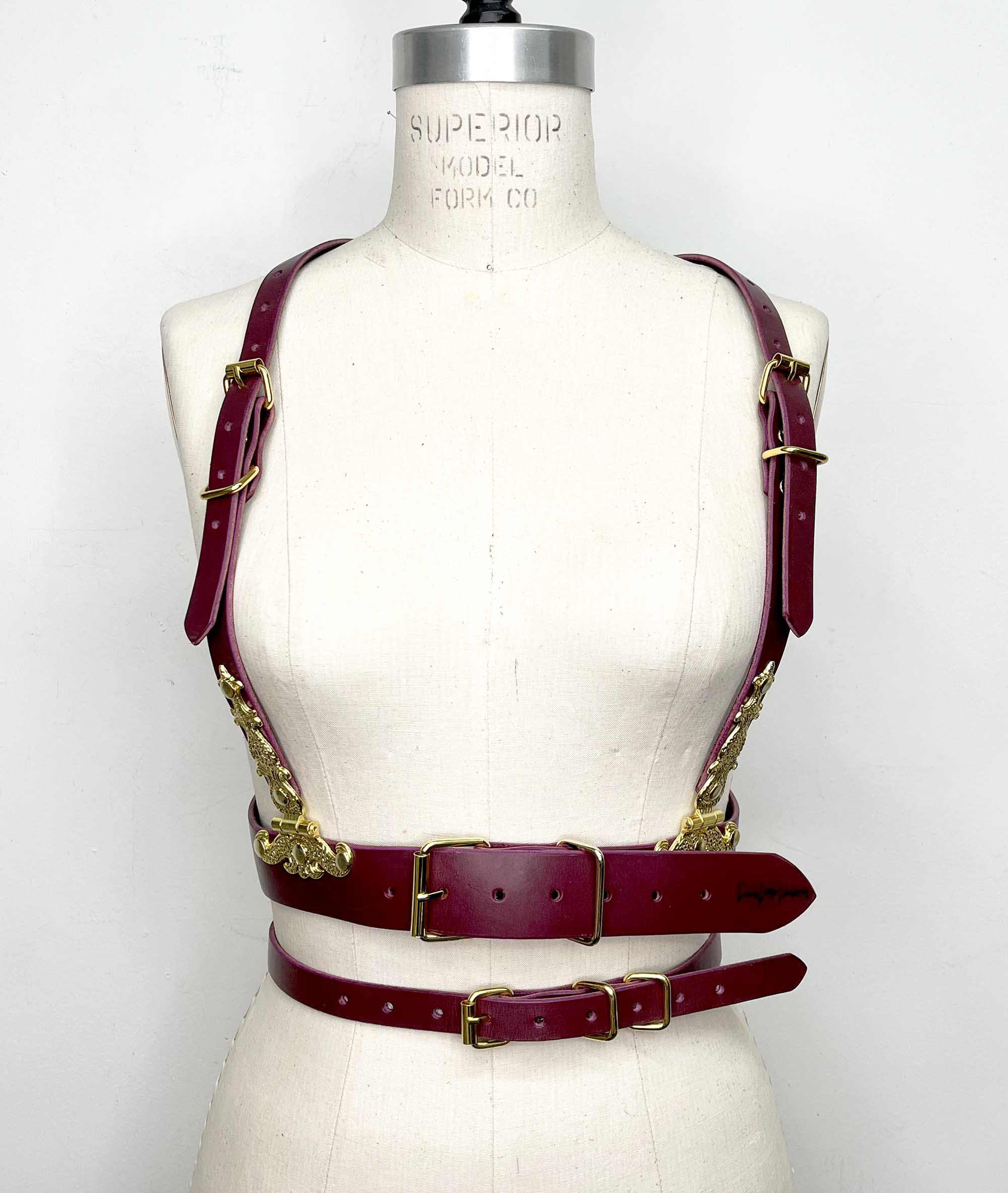 Classic leather body harness with double waist band and large gold hinge detailing.