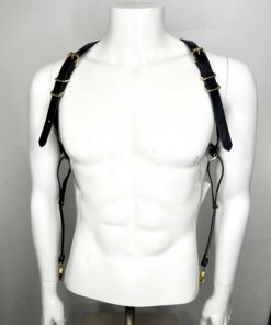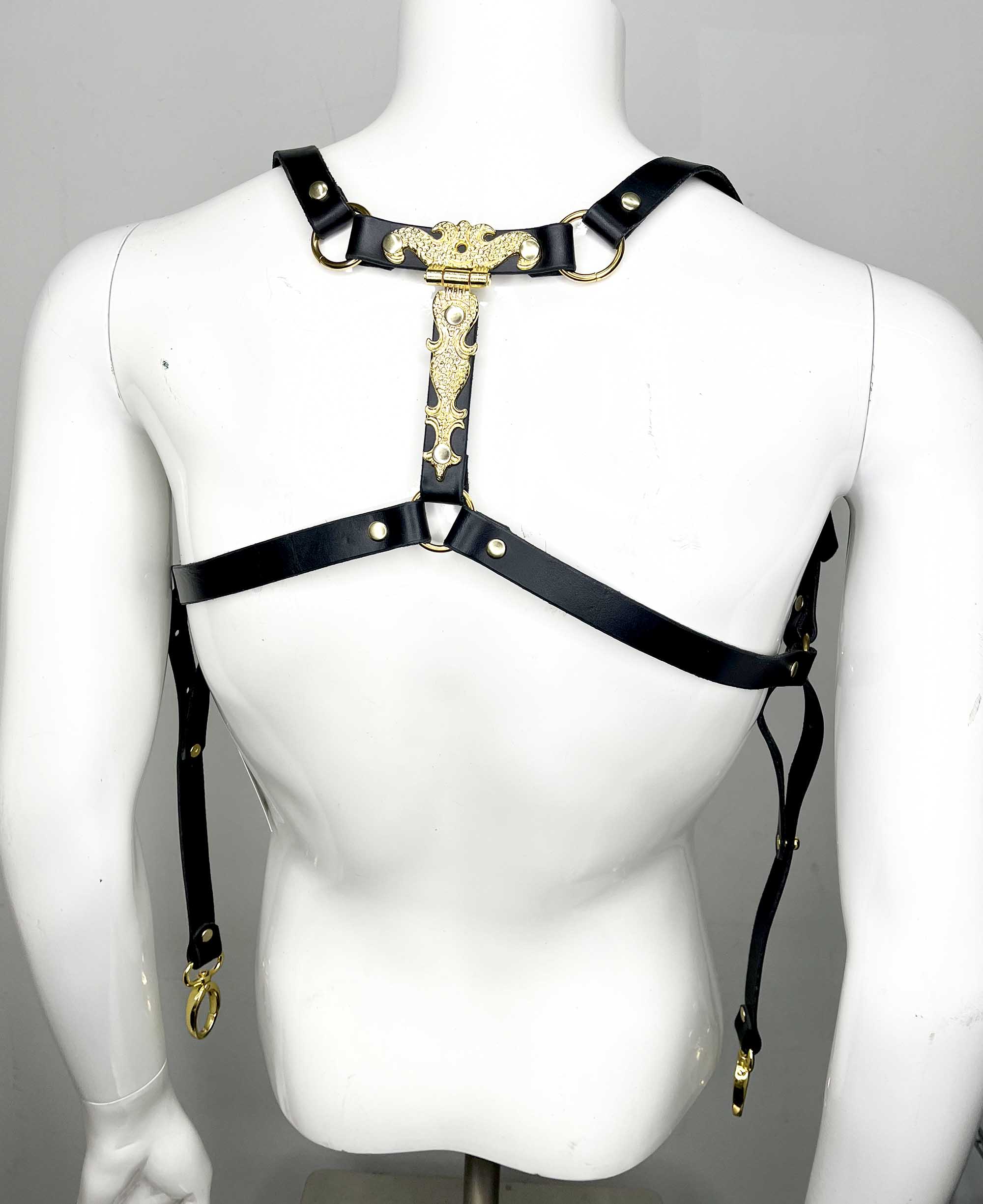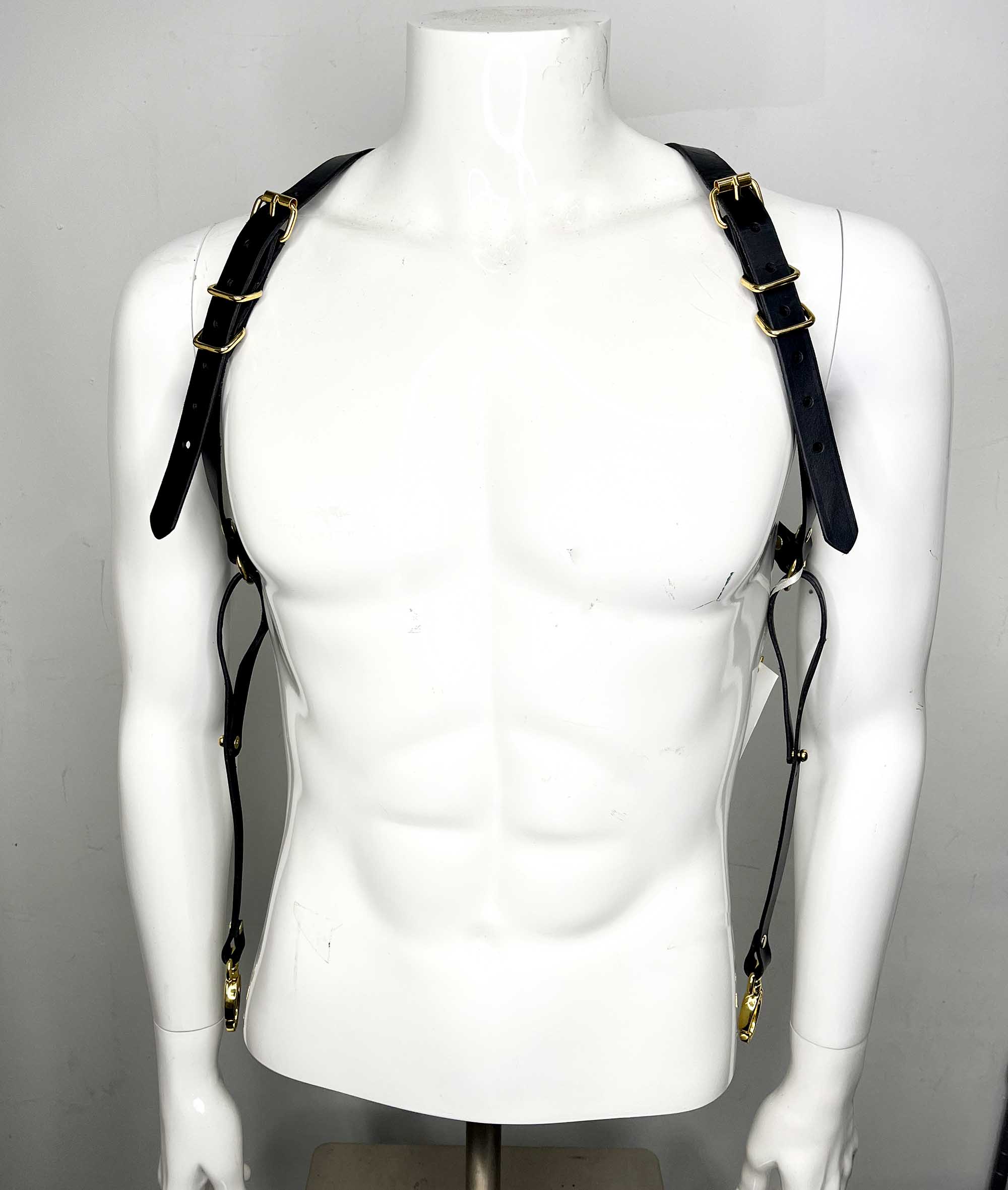 Classic masculine leather suspender harness made from full grain leather with gold clips and gold hinge detail at the back.