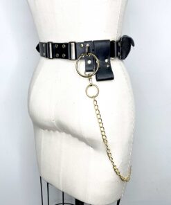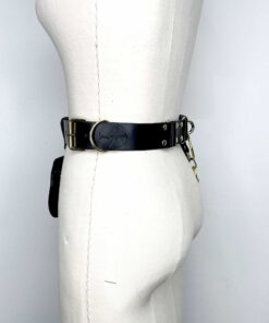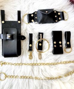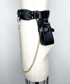 This fully kitted out leather utility belt features a hobble belt core, small leather pouches, a detachable chain leash and multiple clip points to hold various tools!